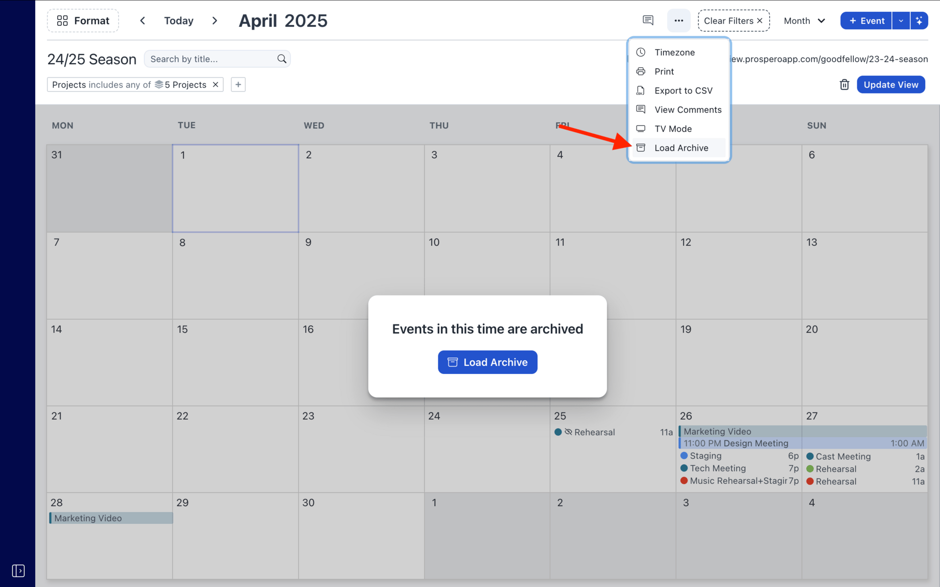 Don't let old events pile up 🍂 Archive them! Keep Prospero fast and efficient — even with thousands of events on your calendar. Event Archiving automatically moves older events out of the initial load, speeding up performance without losing your history. Archived events can’t be edited or seen on shared viewed links, but you can load and duplicate archived events at anytime by scrolling to an archived time period in the calendar or going to the three-dots ⋯ menu in the upper right and selecting Load Archive.