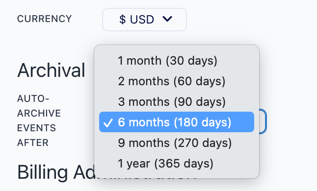 Prospero archives past events each night, but you can control how far back events are auto-archived via Settings → Overview → Archival.